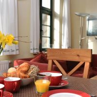Über die Treppe gelangt man ins Obergeschoss mit einem großen Schlafzimmer (Doppelbett mit 2 Matratzen 80 x 200), von dem 2 kleine Schlafzimmer mit je einem Bett (90 x 200) abgehen.
